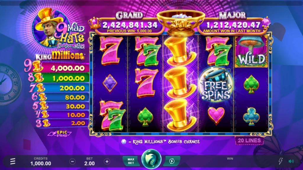 The 9 Mad Hats King Millions Slot is a vibrant and whimsical online casino game that is sure to captivate players with its unique theme and design. The game is set in a colorful world filled with eccentric characters wearing an array of mad hats, creating a fun and playful atmosphere for players to enjoy.